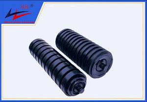 緩沖托輥(impact idler),緩沖托輥用于帶式輸送機受料處減緩落料對輸送帶的沖擊,主要針對洗煤廠、焦化廠、化工廠等腐蝕性環境而研制的一類托輥,它本身具有的韌性是普通金屬的10倍以上,壽命為傳統柱鞋的五倍,耐腐蝕阻燃,自重輕等特點,廣泛用于礦山開采。托輥輥體專用的高分子材料,其機械性能類似于青銅,具有良好的自潤滑性能,不傷皮帶。 緩沖托輥防腐性能優越。輥體及密封件都用高分子材料制作,耐腐蝕。在腐蝕性場合使用,使用壽命可達到普通托輥的5倍以上。